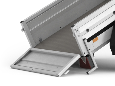 Die abklappbare Rückwand erleichtert die Beladung des Anhängers und ermöglicht auch den Transport längerer Güter.