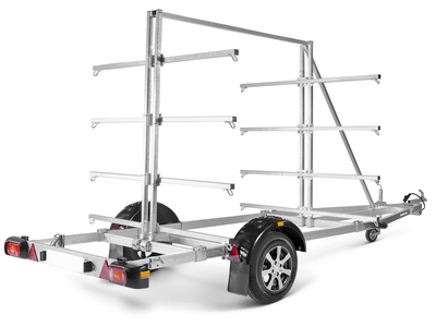 Med en kano/kajak trailer kan du let transportere op til 16 kajakker eller 8 kanoer. Stativet tilpasses let kanoen eller kajakkens størrelse. Den V-formede trækstang gør det muligt for dig at køre sikkert til nye eventyrer. Den totale højde på bådtraileren, når stativet er monteret, er 240 cm. Selve stativet har følgende mål, højde 200 cm, længde 199 cm, bredde 191 cm, læsselængde 344 cm og læssebredde pr. side 85 cm. Vi gør opmærksom på, at billederne kan være illustrative, og trailerne kan derfor være vist med ekstraudstyr.