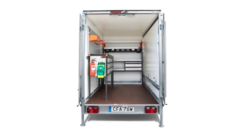 Utrusta din arbetsdag med en specialanpassad arbetsvagn, framtagen för servicetekniker och kraftledningsarbetare. Det smart inredda släpet erbjuder generösa förvaringsutrymmen och en bekväm arbetsyta där du kan stå och jobba smidigt. Perfekt för att transportera tung utrustning samtidigt som du har allt lättillgängligt för att utföra dina uppdrag effektivt. En pålitlig partner för service och underhåll – oavsett om du arbetar med fiberinstallationer eller andra tekniska utmaningar.