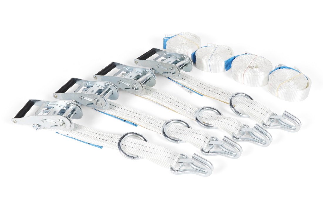 Set av justerbara band med spännanordningar, används för att säkra och stabilisera båten under transport. 4-pack band 2000mm & spännare.